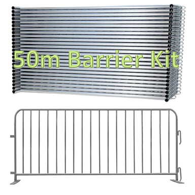 50m Crowd Control Safety Pedestrian Barrier Kit Galvanised Each 100m barrier bundle includes: 22 off x galvanised barriers (11kg each, 2.3m wide x...